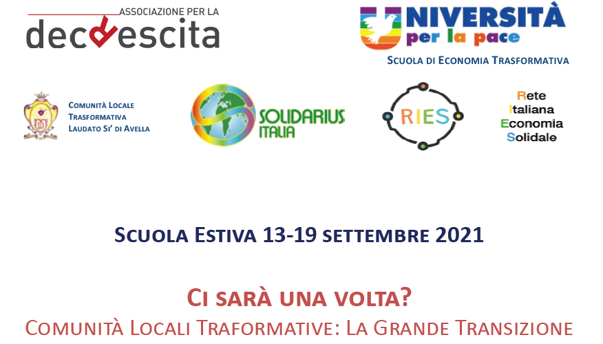 L’associazione per la Decrescita, L’Università per la pace, la comunità locale trasformativa Laudato sì di Avella, Solidarius Italia, Ries, sono gli enti che daranno vita alla scuola Estiva “Ci sarà una volta? Comunità Locali Trasformative: La Grande Transizione, che si svolgerà dal 13 al 19 settembre ad Avella, Avellino.