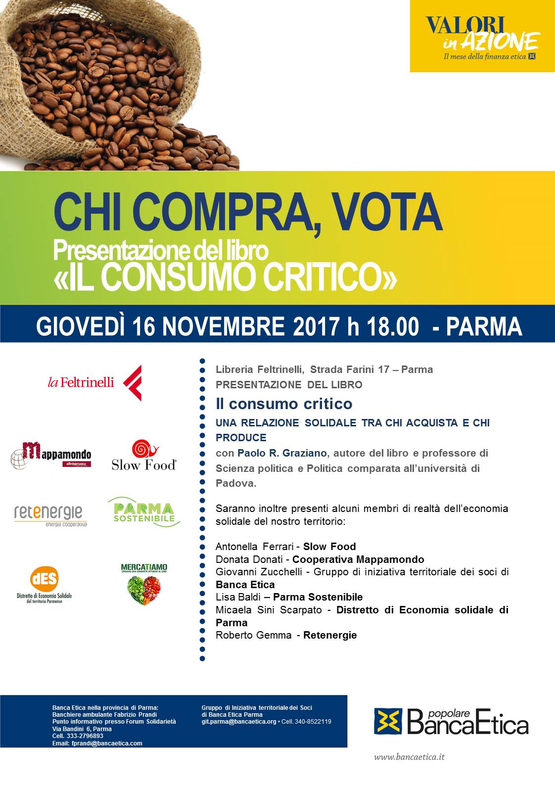 Giovedì 16 Novembre ore 18 presso Libreria Feltrinelli via Farini 17, presentazione del libro”Il consumo critico”, una relazione solidale tra chi acquista e chi produce a cura di Paolo R. Graziano