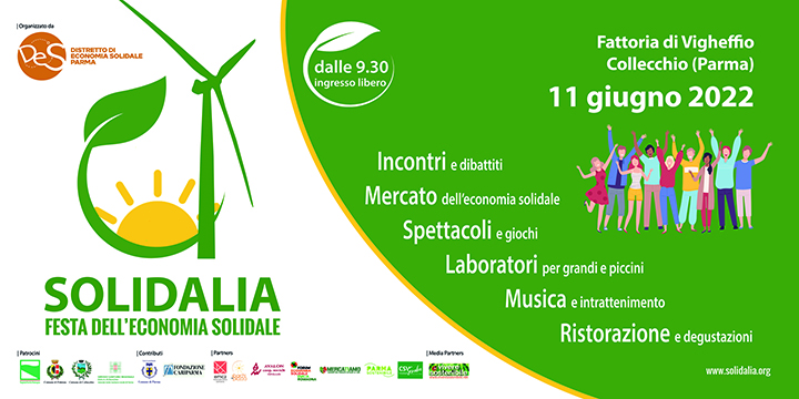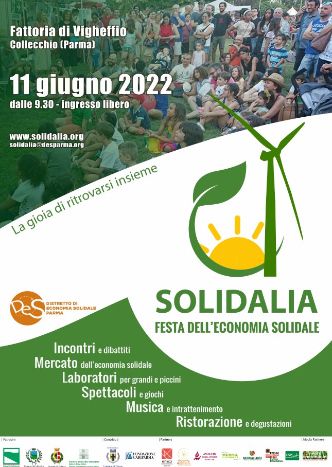 Arriva nel nostro territorio una nuova occasione di confronto, approfondimento e divertimento sui temi della sostenibilità sociale e economica, ambientale e alimentare: SOLIDALIA 2022, la FESTA DELL’ECONOMIA SOLIDALE è una manifestazione promossa da DES (Distretto Economia Solidale) – Parma e si terrà sabato 11 giugno dalle ore 9.30 a mezzanotte presso la Fattoria di Vigheffio (Collecchio). Le cittadine e i cittadini potranno partecipare in modo libero a gratuito a un’esperienza unica di immersione nei tanti temi che l’economia solidale implica. Ma SOLIDALIA non è solo una festa: è anche un mercato, ricchissimo di varietà alimentari e artigianali, un’occasione per incontri e laboratori, concerti e mercatino del riuso. La festa è organizzata dal DES – Parma, ilDistretto di Economia Solidale cittadino, in collaborazione con Comune di Parma, Comune di Collecchio e Comune di Fidenza, AUSL di Parma, Emc2 Onlus, Avalon e con il contributo di Fondazione Cariparma.