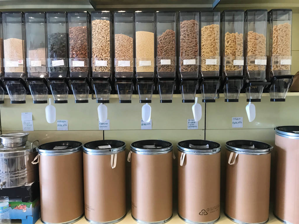 Dove possibile, viene intelligentemente preferito il dispenser: pasta, frutta secca, detersivi ed altro vengono venduti a peso, garantendo così il non spreco e un uso limitato di plastica.